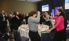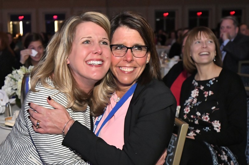 Leaders and staff from West Goshen Elementary School, as well as Goshen Community Schools leaders and officials, take to the stage to celebrate West Goshen's 2018 TAP Founder's Award. The honor, created by NIET Chairman and TAP Founder Lowell Milken (far left) comes with a $50,000 cash prize. NIET CEO Dr. Gary Stark (far right) joined Lowell Milken in the presentation.