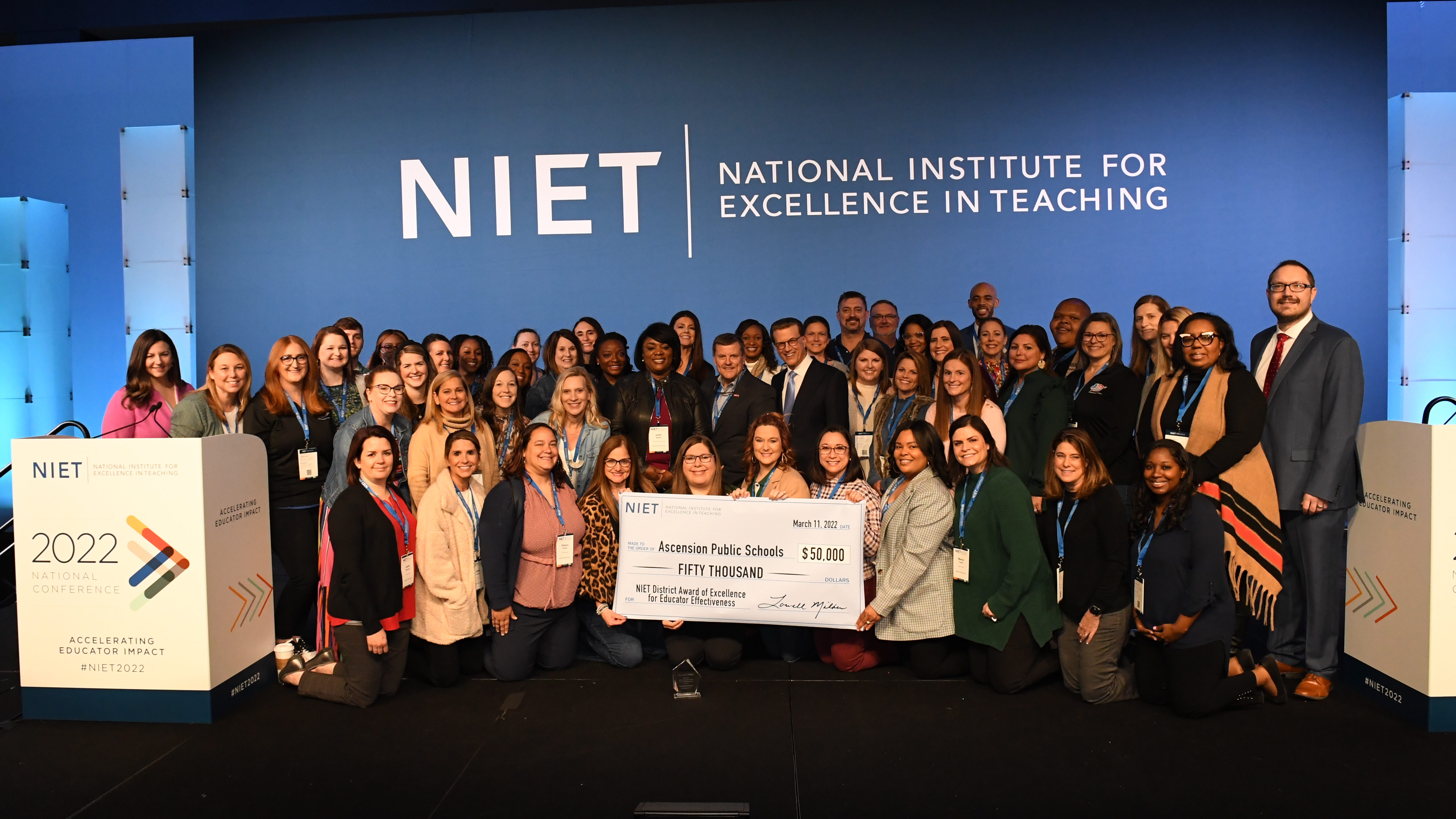 NIET Founder and Chairman Lowell Milken, Co-President and Chief Operating Officer Dr. Joshua Barnett, and Co-President Laura Encalade present the 2022 NIET District Award of Excellence in Educator Effectiveness to Ascension Public Schools.