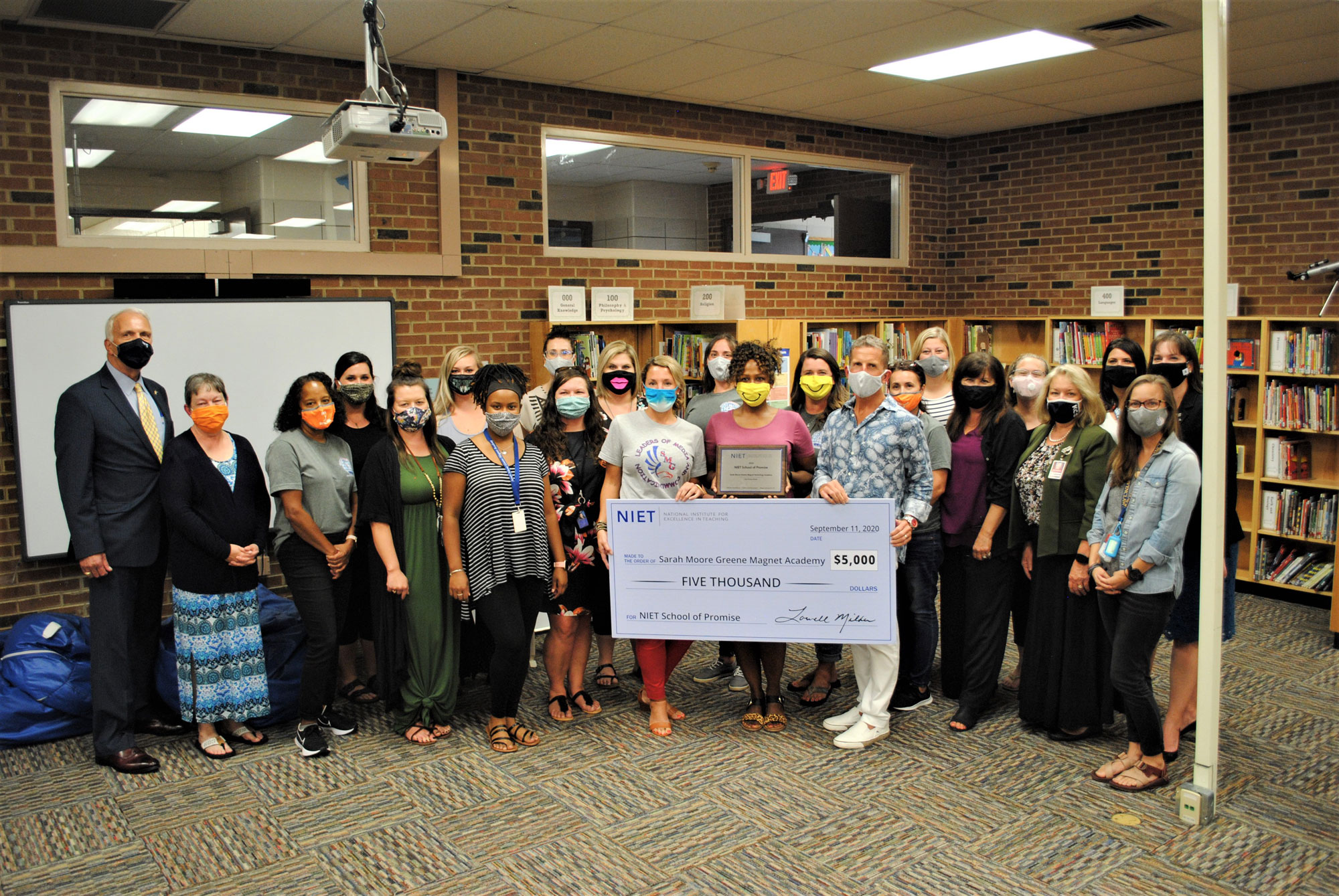 NIET CEO Dr. Candice McQueen presents the 2020 NIET School of Promise Award to Sarah Moore Greene Magnet Academy Principal Robin Curry. The award comes with a $5,000 prize.