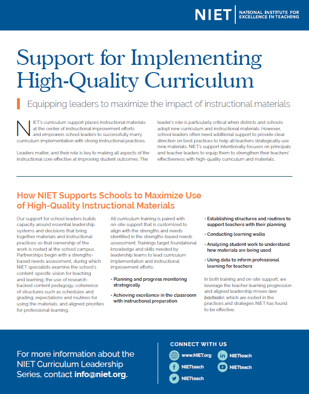 NIET’s curriculum support places instructional materials at the center of instructional improvement efforts and empowers school leaders to successfully marry curriculum implementation with strong instructional practices.